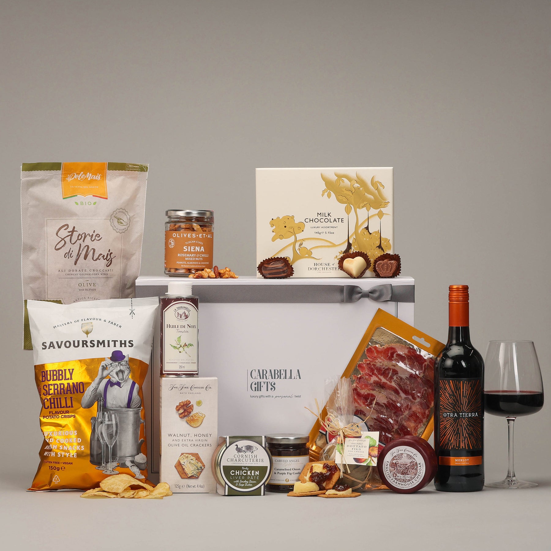 A keepsake gift box filled with red wine, cheese, and a superb selection of delicious savoury biscuits and snacks.